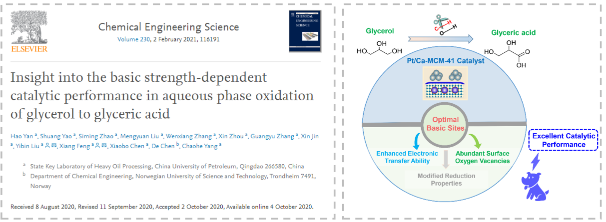 题为《深入了解甘油液相氧化制甘油酸体系中碱强度对催化性能的影响》(Insight into the Basic Strength-dependent Catalytic Performance in Aqueous Phase Oxidation of Glycerol to Glyceric acid)的论文发表在Chemical Engineering Science上。公司团队博士后闫昊为第一作者,刘熠斌副教授和冯翔教授为论文通讯作者。