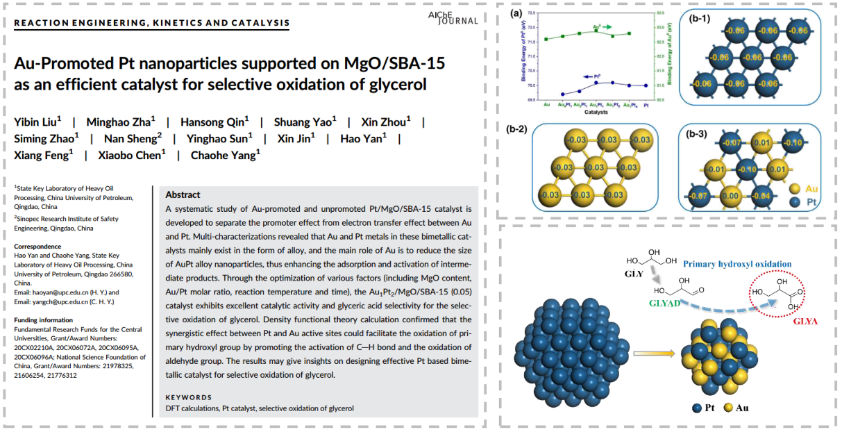 题为《Au助剂促进的Pt/MgO/SBA-15催化剂用于甘油高效选择性氧化》(Au-Promoted Pt Nanoparticles Supported on MgO/SBA-15 as an Efficient Catalyst for Selective Oxidation of Glycerol)的论文发表在AIChE Journal上。公司副教授刘熠斌为第一作者,闫昊博士后和杨朝合教授为论文通讯作者。