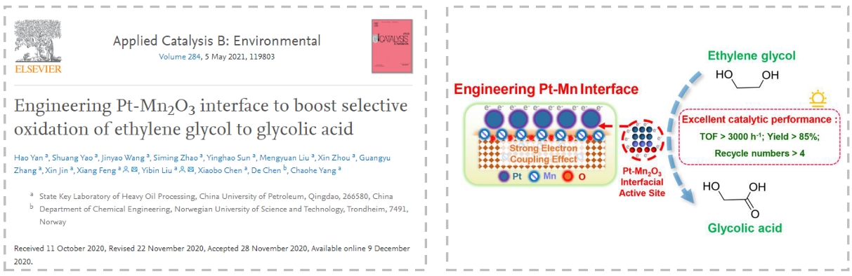 题为《Pt-Mn2O3界面工程促进乙二醇选择氧化制乙醇酸》(Engineering Pt-Mn2O3 interface to boost selective oxidation of ethylene glycol to glycolic acid)的论文发表在Applied Catalysis B: Environmental上。公司团队博士后闫昊为第一作者,刘熠斌副教授和冯翔教授为论文通讯作者。
