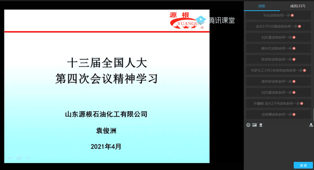 讨论区,员工们纷纷向主讲人袁俊洲送花点赞,并分享自己的学习感受。化学工程与工艺2003班员工沈玲在会后表示:“这堂课让我更加深入地学习了两会精神,让我知道了一年来国家的发展成果和未来的发展战略方向。袁师兄带领我们学习了总书记的讲话精神,也通过图文让我们身临其境地体验了人大代表的工作,我们受益匪浅。”