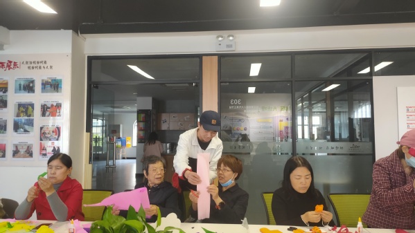 活动初,团支书赵莹莹向参与老人进行班级介绍,现场老人对到场员工表示热烈欢迎。随后,赵莹莹对即将开展的纸花制作活动作说明,并安排员工分发材料。紧接着,赵莹莹详细讲解并示范了玫瑰、薰衣草和郁金香的制作,同时为有困难的参与者提供帮助。员工与老人在制作过程中积极交流,互相分享制作经验,讨论各自制作的花的种类。最后举办成果展,所有人共同欣赏活动作品,员工与社区老人合影留念。其中一位参与活动的老人在结束后感叹:“我做的这是‘奶奶花’,看着它感觉我也变年轻了!”