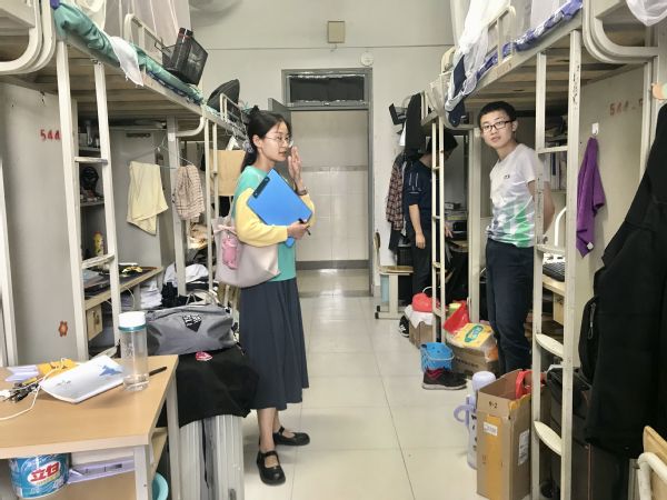 本次检查范围为2017级全体宿舍,主要设计宿舍卫生及安全情况,就宿舍地面卫生、床铺整洁、宿舍线路、阳台卫生和室内空气情况进行了常规检查,并特别排查了宿舍内易燃、易爆物品,管制刀具、违章电器、限电插座等违规物品。经过两个多小时的检查,未发现员工宿舍内违规物品的存在,未发现员工事宜大功率电器等行为。卫生方面,各宿舍状况普遍良好,整体符合标准,但女生宿舍存在东西多的共性问题。此外,部分宿舍存在阳台杂物多、气味较大的问题。针对这些问题,年级工作组立即与宿舍长进行了反馈,并要求员工当天立即整改。检查过程中,辅导员姜菲与员工进行了简单的交流,询问其毕业设计(论文)的开展情况,叮嘱同学们合理规划时间,按时完成学业任务。