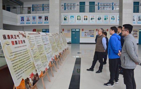 会后,中心组全体成员在学院大厅观看学院廉洁从教警示教育展。
