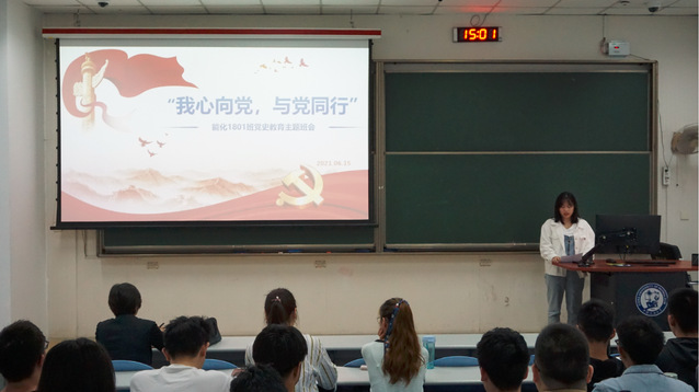 6月15日下午,能化1801班于西环205教室举办“我心向党,与党同行”主题班会,学院副经理刘欣梅、2018级辅导员刘伟以及班级全体成员参加。