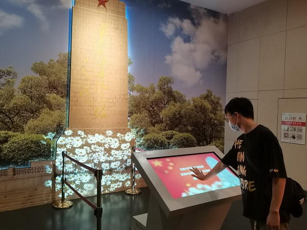 纪念馆中矗立着一座小小的纪念碑,碑前是一个电子屏幕,只要来往游客将手按在上面,展厅内的灯光便会在碑身前投影出一朵纯白色的菊花,象征着对烈士的尊敬。实践队员们纷纷上前,注视着眼前的纪念碑,将自己的手庄重的按在屏幕之上。“我在大屏幕上按下手印,成为无数祭奠者中的一员,相信之后济南战役的革命精神会感染更多的人。”实践队员张智伟如是说道。