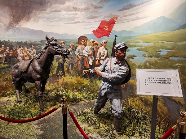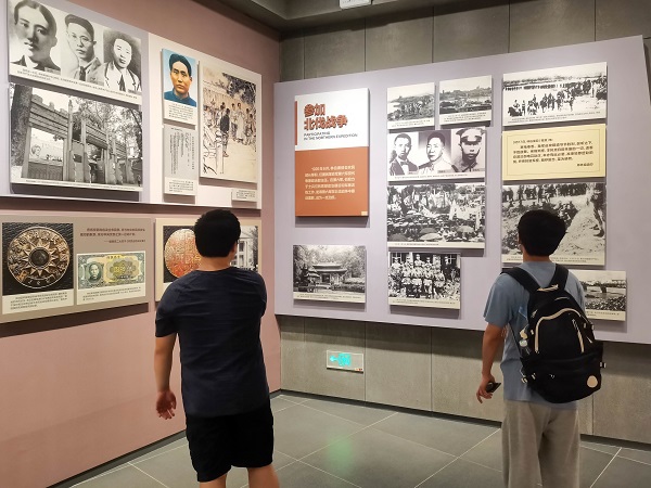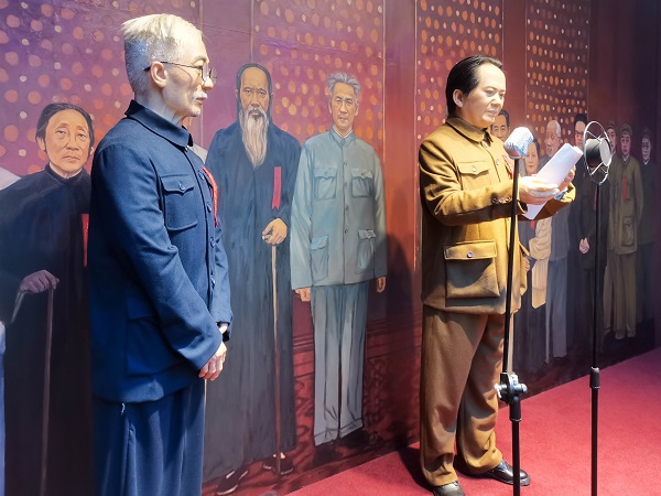 参观完故居后,实践队来到了林伯渠生平陈列馆,走进大门,便看到林伯渠先生伟岸的雕塑,背后写着醒目的八个大字“开国大典的主持人”,往里走,便来到了生平陈列室。陈列室内容一共分为八个部分,从林伯渠走出凉水井,追随孙中山参加革命运动,到为国共第一次合作搭桥,再到参加北伐战争,领导农民运动等等,一直到最后的主持开国大典。每一部分都详细介绍了林伯渠先生做出的贡献,并用雕像,遗物,文献记载等展现得淋漓尽致。最让人感到身临其境的是陈列室中央开国大典的场景,在走廊的一侧是开国大典时毛主席和林伯渠先生的等身蜡像,走廊另一侧循环播放着当年开国大典的录像带,实践队每个成员都像当年站在天安门城楼下的百姓,内心充满了激情与自豪感。