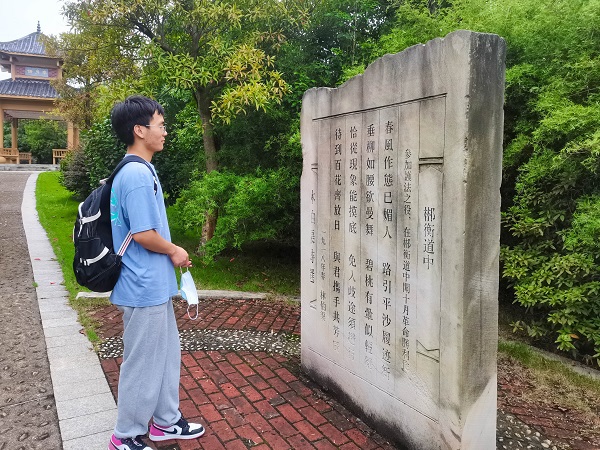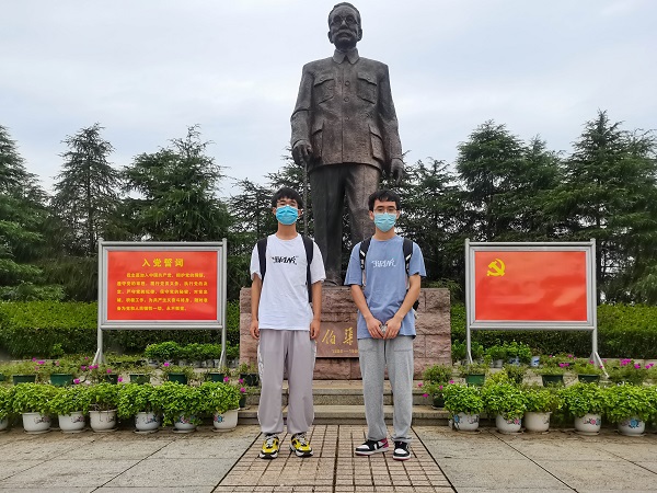 最后,实践队爬上故居旁的小山,在绿茵笼罩的石子路上向上走着,不时会看见刻有林伯渠先生诗作的石碑,每到一个石碑,实践队都会停下来欣赏,体会林伯渠诗作描绘的革命精神。最终走到山顶,实践队成员与林伯渠先生的雕塑一起合影留恋。