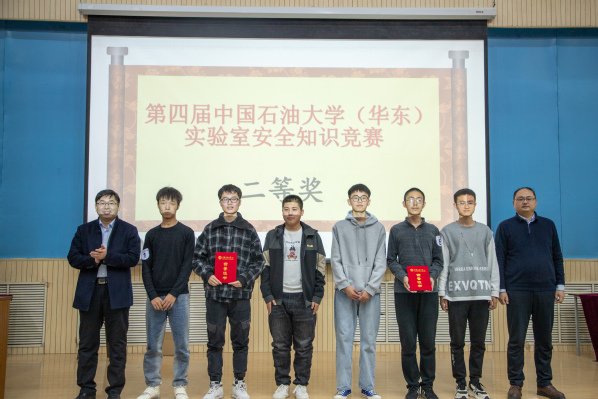 此次竞赛分为初赛和决赛两阶段。比赛初期,赛事组织者通过微信公众号、网站等多渠道发布电子海报、短视频吸引来自16个学院的超2000人次参加。百余支报名参赛队经过一周的准备,进行了激烈的初赛角逐,最终27位参赛选手组成的9支代表队进入决赛。决赛伊始,实验室管理处副处长成宏涛致开场辞,之后,各代表队登场介绍队名与参赛口号。在主持人宣布比赛规则之后,比赛正式开始。经过第一轮必答题与抢答题的角逐后,胜出的六支队伍进入第二阶段的风险题与必答题环节,最终经过激烈的角逐,来自2021级应化专业的第九队脱颖而出获得一等奖,由2020级化工专业员工组成的第一队、理学院2021级化学专业员工组成的第五队获得二等奖,由化工学院2021级研究生组成的第三、第七、第八队获得三等奖,第二、第四、第六队获得优秀奖。除此以外,比赛期间还设置观众互动环节,在场员工踊跃参与答题,赢取了丰厚的奖品。比赛结束后,到场嘉宾上台为获奖队伍颁发荣誉证书和奖品并合影留念。参赛选手应化2101滕国钊在赛后讲到:“本次竞赛的题目与实际操作紧密相关,对于提升大家的安全意识和安全应急处理能力有很大帮助,能有效降低实验中存在的安全隐患。”
