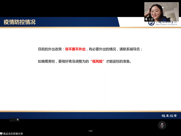 首先,栾琳简要通报当前黄岛区、莱西市的疫情情况,强调同学们应认识到当前疫情的严重性,自觉遵守学校的相关政策,积极主动报备信息,认真落实核酸检测要求,做到非必要不外出。随后,栾琳详细介绍了校内发热员工的的应急方案,并要求同学们加强体育锻炼,保持良好的心态,一旦发烧务必如实上报。接下来,栾琳明确了本学期疫情防控通打卡、核酸抽检、青年大学习、宿舍卫生等各项工作的要求,希望同学养成良好生活习惯、打好学业基础,找好未来方向。最后,魏孟吉强调本学期党员发展、学风建设、心理健康调节等工作,他表示目前2020级已经进入大二下学期,未来将面临人生的重要选择,希望同学们把握当下,不断提高学业成绩,为未来打下坚实基础。