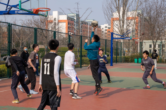 “快上!”“防守!”只听得赛场上双方队员大声喊着,各自配合默契。员工们积极进攻、拼抢篮板,带球、传球、后仰跳投,一系列动作一气呵成赢得场外阵阵喝彩。辅导员们也不甘示弱,断球、上篮同样精彩。两队队员在战略战术上不断地进行调整,随着最后一声哨响,四节比赛结束,队员们意犹未尽。比赛结束后,参赛队员于兴旭表示:“在校园封闭管理期间,很多同学都缺乏锻炼身体的机会。本次师生友谊赛丰富了我们的校园生活,强身健体的同时还加深了师生之间友谊。”