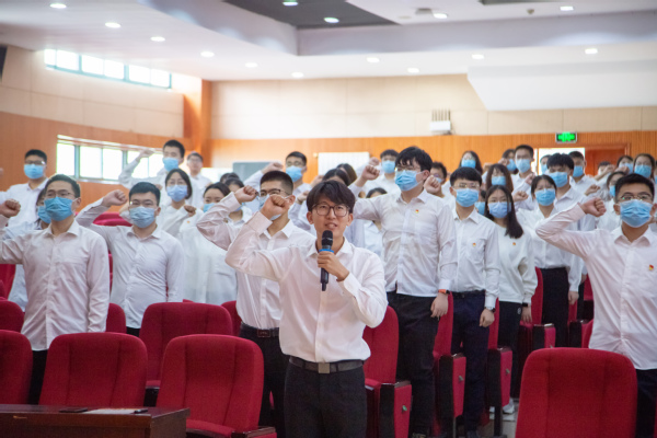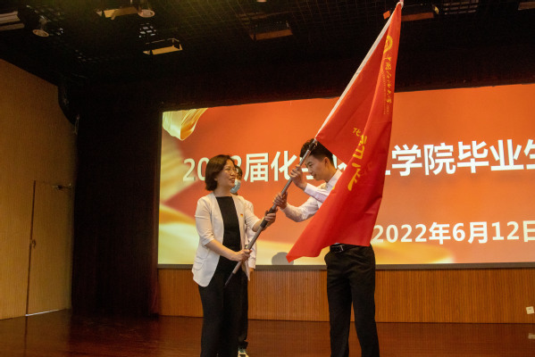 梁秀萍与张永宁分别为2022届本科毕业生党员青年先锋队和研究生党员青年先锋队授旗,旗面上“化育初心 工致报国”八个字是学校学院对青年员工的期许和鼓励,希望石大化院人能在新的院校或岗位上,学先锋、做先锋,开拓奋进、再谱新篇。授旗仪式后,全体党员高举右拳,庄严宣誓:“愿以吾辈之青春,复兴伟大之中华!奋斗正青春,青春献给党!请党放心,强国有我!”
