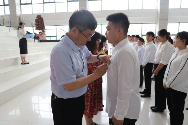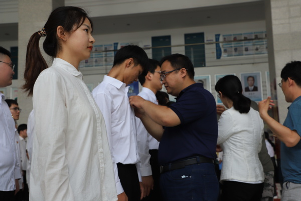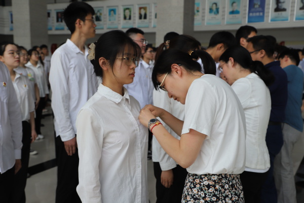 教师党员给新党员佩戴党徽