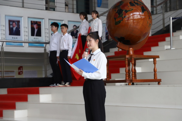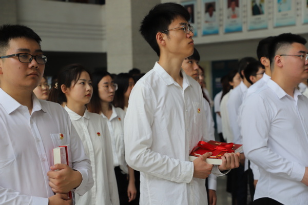 在庄严雄壮的国歌声中,大会拉开帷幕。教师党员代表为38名新党员佩戴党徽、发放党章,嘱托新入党党员要严格要求自己,敢于亮出身份。环境本科生党支部龚洁仪代表新发展党员新发展党员发言,她郑重承诺,将牢记初心使命,练就过硬本领,勇担时代重任,用拼搏奋斗谱写青春最靓丽的底色。