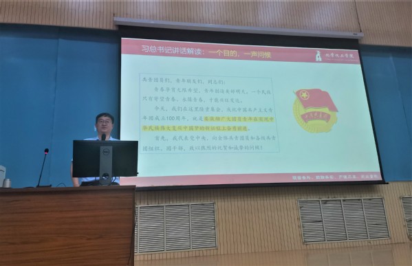 张永宁带领员工回顾了中国共产主义青年团的发展历程,用习近平总书记讲话中提取的“四个阶段,四个贡献”以及团员要做到的五个模范激励团员,要永保加入共青团的初心,坚定不移跟党走,为党和人民奋斗,将自身的发展同祖国的富强紧密联系在一起。张永宁希望2021级军训员工通过党史学习教育,能够积极主动学习,努力提升自己,抓住学校、学院面临的重大战略机遇期,实现自身的高质量发展,以优异成绩迎接党的二十大。