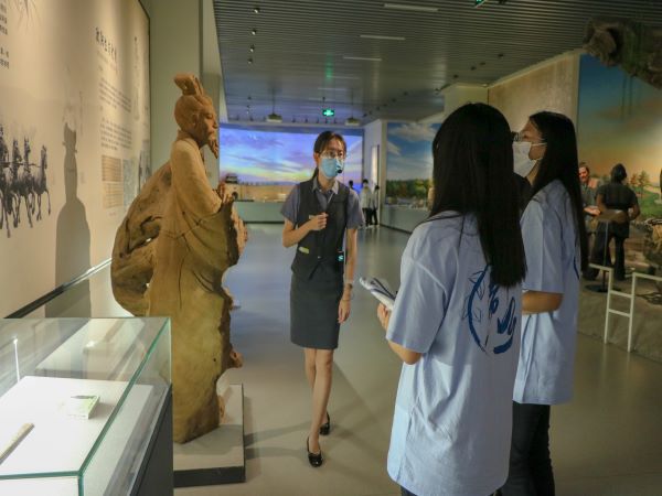 参观结束后,实践队队长刘小婷与讲解员进行了交流与访谈,同时邀请了讲解员与其他游客填写了黄河湿心的线下调研问卷。结束后,刘小婷带领调研队其他成员参观了文化馆一层党建中心文化,感悟东营市的红色文化,传承根植油田的红色基因。