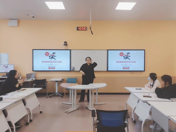 窦雅琴首先介绍了团体辅导的优势、整体结构和活动原则。随后从活动暖身阶段、相识阶段和结束阶段分别进行了现场示范和讲解。在暖身阶段,窦雅琴带领大家通过活动《电门》,带领大家体验。相识阶段通过活动《驿站传书》,带领大家体验游戏背后的教育意义。结束阶段体验了活动《爱的协奏曲》,带领心理委员了解如何将活动的教育意义有所升华。