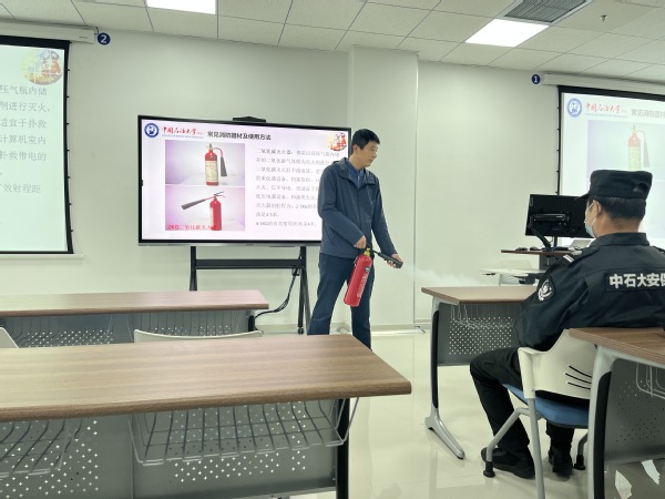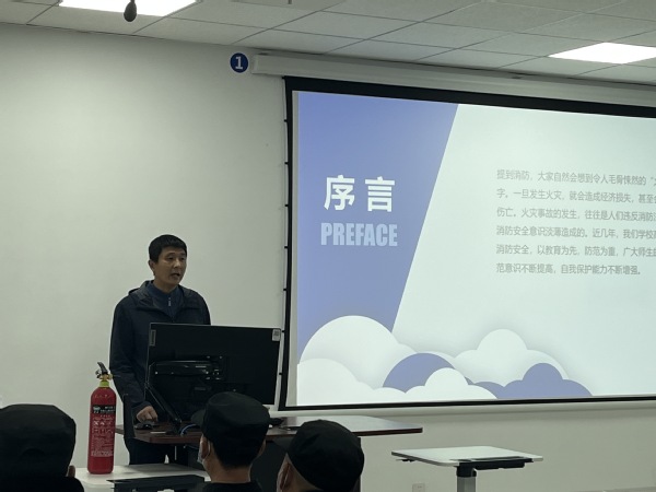 讲座伊始,石鹏飞以近几年高校实验室安全事故、宿舍安全事故为引,突出介绍了不规则使用实验仪器、宿舍使用违规电器、缺乏安全意识所造成的严重后果,强调了消防安全知识的普及的重要性。他表示,火灾事故的发生,往往是人们违反消防法律法规、消防安全意识淡薄所造成的,同学们需要高度重视,不断提高自我防范意识以及自我保护能力。紧接着,石鹏飞告诫员工要牢记消防安全知识,用视频指导员工处理消防事故的办法,分享了逃生经验以及技巧。最后,石鹏飞就“如何正确使用灭火器”进行了具体讲解以及现场演练。