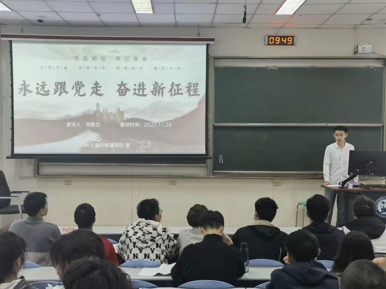 化蕴先锋宣讲团成员孙新龙“从一到九”带领能化2102、本研2101团支部学习了二十大精神的主要内容,就铭记历史,奋发图强,对党的二十大精神作了深入阐释,随后孙新龙带领支部成员回望建党初期青年的艰苦奋斗,深入解读党的二十大精神,督促支部成员要牢记习近平总书记嘱托,坚定理想信念,筑牢精神之基,厚植爱国情怀,矢志不渝跟党走,以实现中华民族伟大复兴为己任,增强做中国人的志气、骨气、底气,不负时代,不负韶华,不负党和人民的殷切期望。第二场宣讲中,先锋宣讲团成员覃羽彤向化工2203团支部的同学们进行宣讲,覃羽彤根据自身参加科创比赛的经历,结合二十大会议精神,引导员工们作为新时代的新青年,要在日常学习生活中养成守正创新,勇毅前行的良好品质,要有“十年磨一年”的毅力,扎实学习专业知识,勇于创新,创先争优。