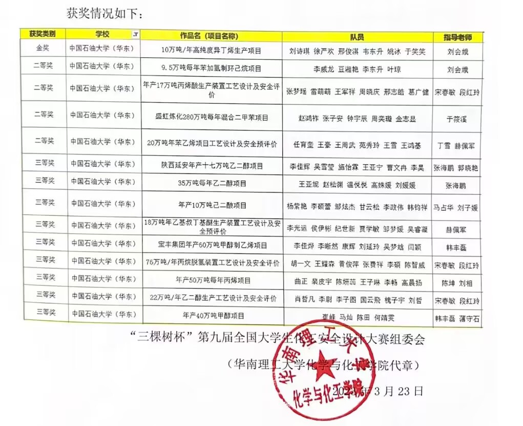 近日,“三棵树杯”第九届全国老员工化工安全设计大赛全国总决赛在华南理工大学线上举行。经过激烈角逐,由公司教师刘会娥指导,本科生刘诗琪、于笑笑(机电学院)、邢俊淇、韦东升、姚冰、徐严欢组成的The Stars团队获得全国金奖,刘会娥获“最佳指导教师”奖。另有4支队伍获得大赛二等奖,9支队伍获得三等奖。