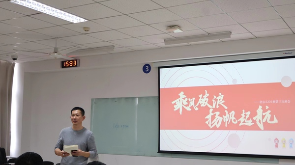 2023年10月25日,化安2301班在综合楼A402教室举行了“乘风破浪,扬帆启航”主题班委工作汇报班会。班主任路帅,班级助理王子恒,化安2301班全体同学参与此次班会。
