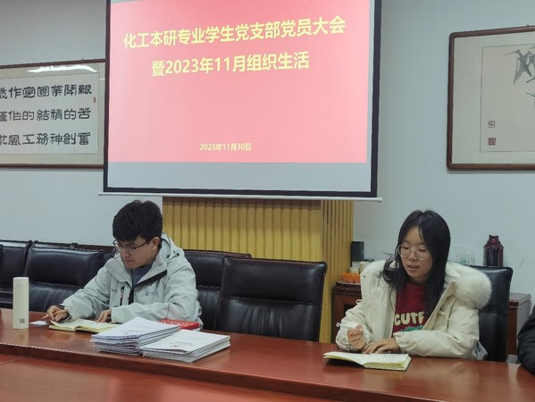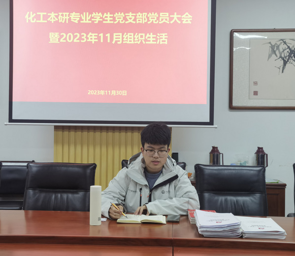 2023年11月30日晚,化工本研专业员工党支部于工科实验楼A座121会议室召开党员大会,讨论接收新发展党员并组织集中学习。本次大会由支部书记赵成义主持,支部全体党员出席本次会议。