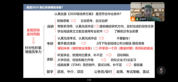 王兆兴首先总结了2023学年,年级在主题教育、日常管理、典型选树、学风建设、就业工作、员工党建、共青团等方面的工作思路、做法及成效。紧接着,他结合2023年就业数据及员工问卷调研数据,对员工就业关注的几个问题进行了分析与解答,建议员工们正确把握求职节奏,早准备、早选择,积极投递简历、参加面试。随后,他对2024年春季学期年级工作做出规划,根据各类毕业生选择分析了新学期应完成任务及注意事项,尤其是对于考研同学,应充分利用好寒假时间继续备考复试,并建议每一名考研同学都最好签一份保底的工作,有目标可选择的进行就业规划。最后,他又强调了寒假假期安全注意事项,结合真实安全事例,从消防安全、交通安全、用电安全、饮食安全、防溺水安全、网络安全、防电诈安全等八个方面,结合大量身边发生的安全事故教训进行了重点讲解,提醒同学们离校前务必要按照学校和学院要求,做好线上和线下的登记报备。会议最后师生互相送上新年祝福,同祝度过一个平安充实的假期。