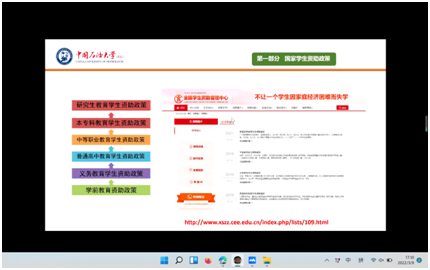 化学2002班的谷超越通过线上的方式,向山东省滨州市阳信县第一中学100多名员工进行了宣讲,介绍了国家老员工资助政策以及威廉希尔体育(华东)的员工资助政策体系。她用自己的实际情况介绍在国家资助政策帮助下如何安心学习、健康成长,扫除他们经济上的顾虑,让他们安心求学。