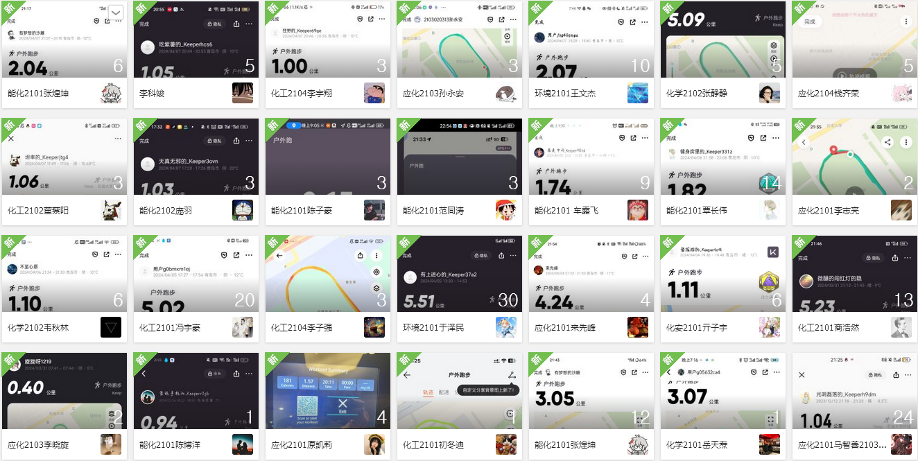 2021级员工工作组继续施行专人督导机制,每周结束定点定时通报个人本周打卡情况。每次跑步打卡结束后,员工通过运动软件进行记录,以截图的形式在跑步群打卡,每一张图片上记录着跑步者的路线与运动时长,同时也记录着他们的汗水与努力。