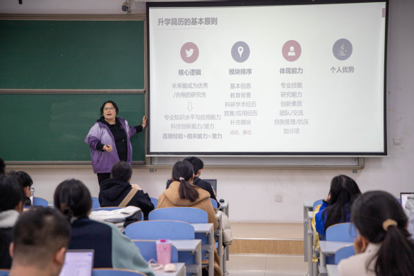 4月13日,学院2021级组织专题讲座,面向年级有推免意向的员工讲解升学简历、个人陈述的写法和面试的准备,学院就业指导老师、年级辅导员窦雅琴主讲。