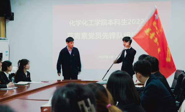 仪式开始,魏孟吉简述先锋队成立的初衷,先锋队二十二名党员同志皆为年级中首批党员,成立先锋队旨在帮助队员们集中学习,相互帮助,共同进步。同时也要求队员们无论是在学习还是生活中,都能够发挥先锋模范作用,以实际行动去践行党的宗旨,为学院及师生做好服务。随后,魏孟吉宣读先锋队通过前期的考察与综合考核,最终确立李煜龙为花青素党员先锋队队长的决定。之后由徐光辉将花青素党员先锋队队旗授予先锋队,告知他们要在党旗的引领下做一名合格的中共党员。与会全体党员起立,面向党旗庄严宣誓,重温入党誓词,回忆加入党组织的初心。接着,徐光辉由党旗的构成追思党的发展历程,从“人民当家作主”开始讲起,逐步深入至当前的严峻国际形势与行业状况,以所学专业为例,提醒先锋队队员要学会分析社会局势,增强自身的使命感与责任感,时刻为报效祖国实现自我价值做准备。通过一个个活生生的例子,提醒先锋队队员们要时刻坚定理想信念,追求不计小我,只求大我的精神高度。最后,先锋队队员进行功能团支部的团支部书记、组织委员与宣传委员的竞选,通过报名与现场投票,确定了李煜龙、张美琪、刘秩伯为团支委成员,并将队员分为了理论学习,实践活动,文体发展及纪律考核四个组织小组,共同承担起功能性团支部的日常工作。