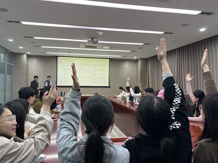为增强同学们的体验感、参与感、获得感,活动采取了分享读书心得和趣味互动相结合的方式,设置有奖问答环节。题目的设立帮助同学们再次回味分享内容,引发听众对于活动的共鸣。在互动环节,各位同学围绕分享人给出的主观题各抒己见、畅所欲言,启发听众对于书籍的思考。活动最后,研会成员王淑磊呼吁道:读书会是一天的活动,但阅读却是一辈子的事情。书香不应仅限于四月春风,更应该弥漫于漫漫人生路的每一程。