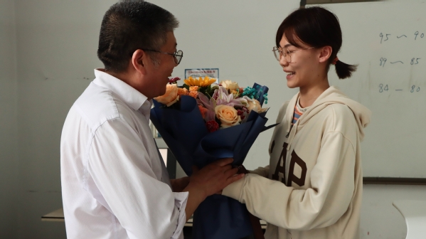 首先,周天润对李宏勋教授的教员工涯进行简单介绍。接着,经管学院员工会员工代表范皙玥为李宏勋敬送鲜花并发表感谢话语。最后,本研化工2201全体成员在周天润带领下齐声喊“翰墨书香世代流芳,育人灵杰桃李满园。衷心祝愿李宏勋老师退休愉快,未来生活圆圆满满,顺顺利利”,表达对老师的祝福与感谢。