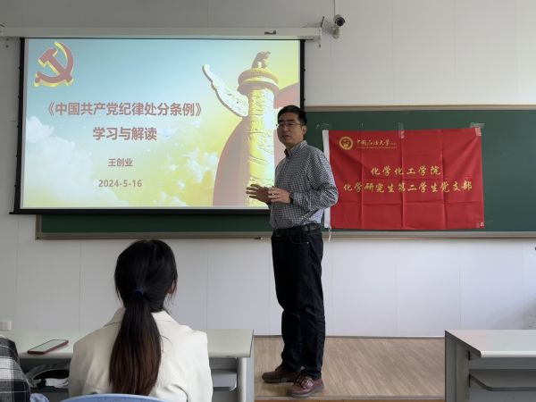 2024年5月17日,威廉希尔官网化学研究生第二员工党支部在南堂205教室开展“学习党纪条例,增强纪律意识”主题学习会。会议由支部书记孙风跃同志主持,支部党员、预备党员参与此次活动,威廉希尔官网党支部书记王创业同志到会指导。