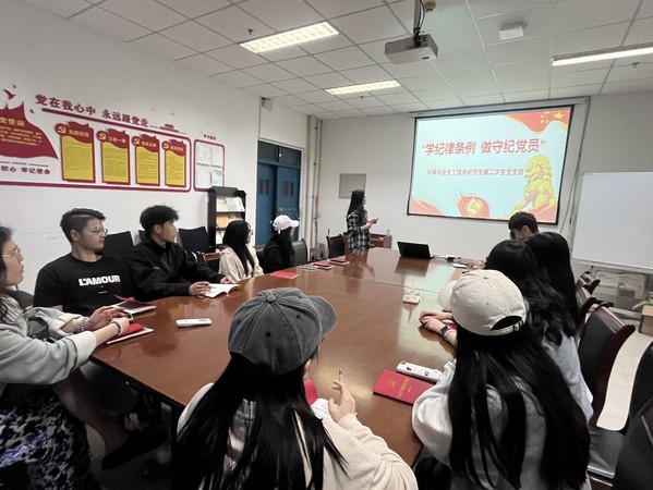 为深入学习贯彻习近平总书记关于加强党的纪律教育的重要论述,进一步增强党支部全体党员纪律意识,推动党纪学习教育入脑入心走深走实,环境与安全工程系研究生第二员工党支部于5月23日开展“学党纪条例,做守纪党员”组织生活。