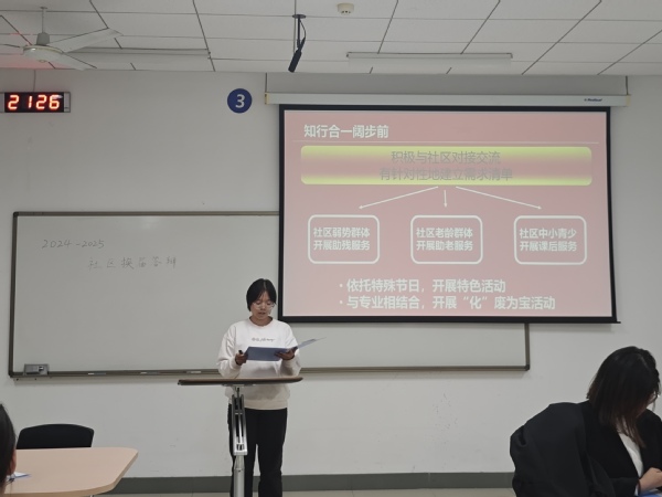 为进一步推进威廉希尔官网老员工社区实践计划的建设管理,探索常态化组织高校老员工到社区开展志愿服务、社会实践的工作模式,10月23日威廉希尔官网实践中心于综合楼A407开展2024-2025学年社区实践团支部选拔答辩。本次换届答辩由各团支部负责人参与,学院实践中心主任张亦弛出席,学院实践中心干事朱紫涵主持。