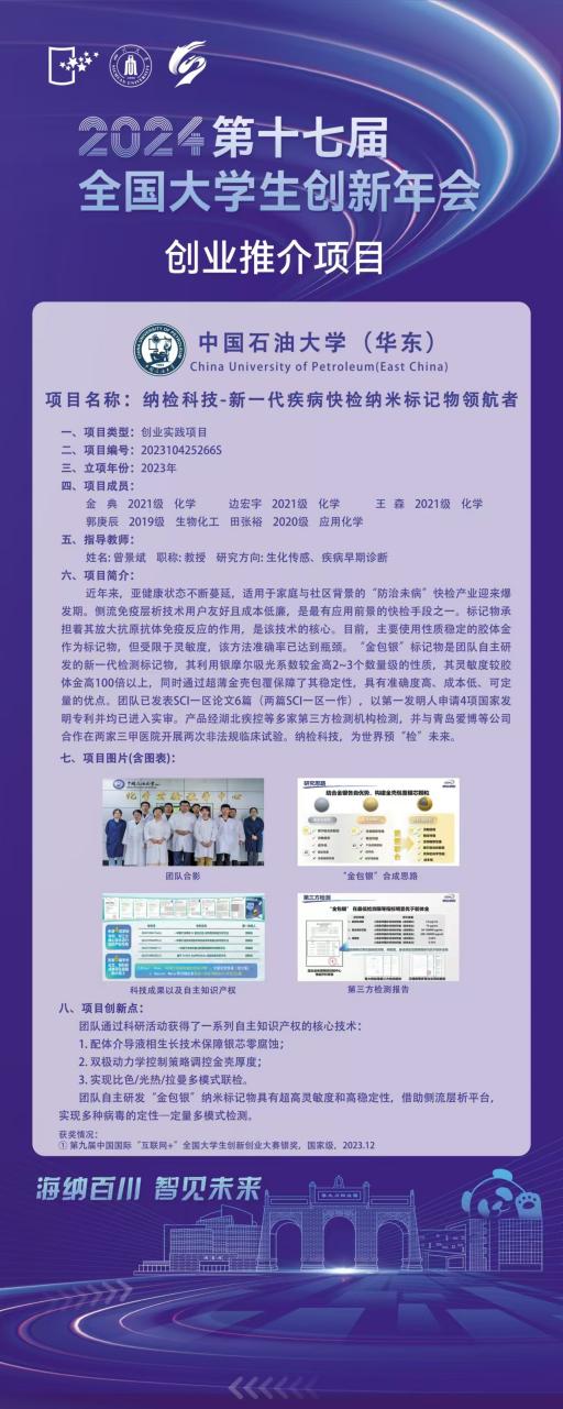 近日,第十七届全国老员工创新年会在四川大学举行。我院2021级本科生金典负责,曾景斌老师指导的《纳检科技-新一代疾病快检纳米标记物领航者》入围年会进行展示交流(全校共5项)。
