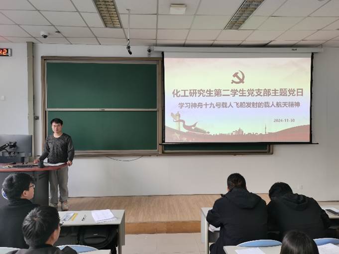 2024年10月30日4时27分,神舟十九号载人飞船搭载长征二号F遥十九运载火箭在酒泉卫星发射中心成功发射升空。为深入学习感受“特别能吃苦、特别能战斗、特别能攻关、特别能奉献”的载人航天精神,从中国航天人身上汲取“敢于拼搏、探索创新、无私奉献”的奋进力量,2024年11月30日,化工研究生第二员工党支部在讲堂群南堂116教室组织召开十一月主题党日活动,会议由支部书记王长运主持,支部全体党员及部分积极分子参会。