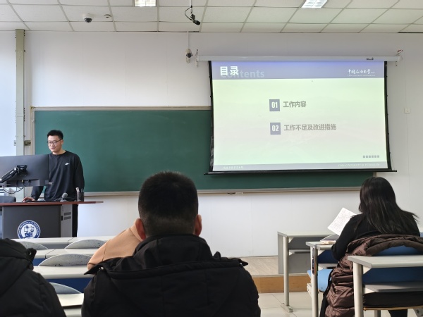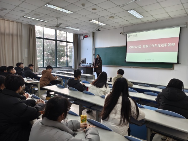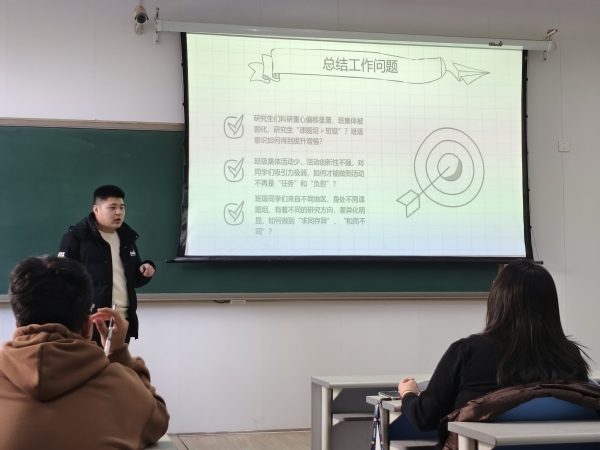 1月7日下午,硕士2024级于南堂108召开班级工作年度述职答辩会。学院辅导员窦雅琴,兼职辅导员赵欣茹、刘辰伟和全体班长团支书参会。
