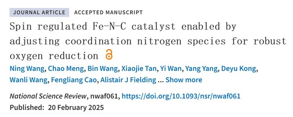 近日,公司胡涵教授联合新能源学院吴明铂教授、上海光源李丽娜研究员、利物浦约翰摩尔斯大学Alistair J Fielding博士等在国际顶级期刊《National Science Review》上发表题为“Spin regulated Fe-N-C catalyst enabled by adjusting coordination nitrogn species for robust oxygen reduction”的研究论文。论文第一作者为公司博士研究生王宁,通讯作者为胡涵教授。该研究工作得到国家自然科学基金、山东省创新发展联合基金等项目支持。