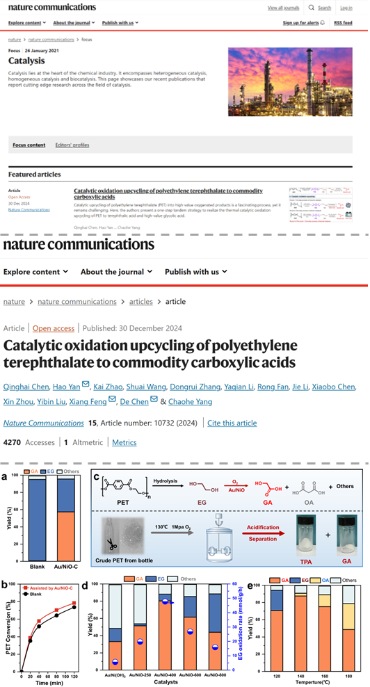 聚对苯二甲酸乙二醇酯(PET)作为全球消费量最大的聚酯材料,广泛应用于包装、薄膜等领域,每年有大量废弃PET被遗弃在自然界中,稳定的结构导致在自然环境中难以降解,造成严重的白色污染。在“双碳”发展理念和循环经济的发展格局下,推动废塑料的高值化转化既可以实现废塑料再生利用,减少化石能源使用,又可以降低二氧化碳排放,保护生态环境安全。针对废弃PET中丰富的含氧单体,将其中乙二醇(EG)转化为高价值的乙醇酸(GA)无疑是一种具有前景的方法。研究团队首次提出热催化一步解聚氧化策略,将聚酯直接转化为商品级乙醇酸晶体。废弃PET在Au/NiO的催化下实现解聚和氧化串联反应,再经过分离和纯化操作,最终得到收率为77.51%的乙醇酸晶体,并通过在载体上引入氧空位,调控催化剂对底物的吸附,从而减弱氧化过程中对苯二甲酸(TPA)的抑制效应,加快乙二醇到乙醇酸的反应速率,实现PET到乙醇酸的高效转化。对比传统的碱性水解,该工艺可获得更高的经济收益(1500$/ton)及产生更少的二氧化碳排放(减少2.25kgCO2-eq/kg PET)。同时将该策略应用于其它聚酯类塑料回收,均获得较高乙醇酸收率(>80%),证明该策略具备较大的工业化应用潜力。相关成果以“Catalytic Oxidation Upcycling of Polyethylene Terephthalate to Commodity Carboxylic Acids”为题发表在NatureCommunications上,并被主编遴选为专题文章(近期发表在催化领域上最好的50篇论文),威廉希尔体育(华东)为第一署名单位。