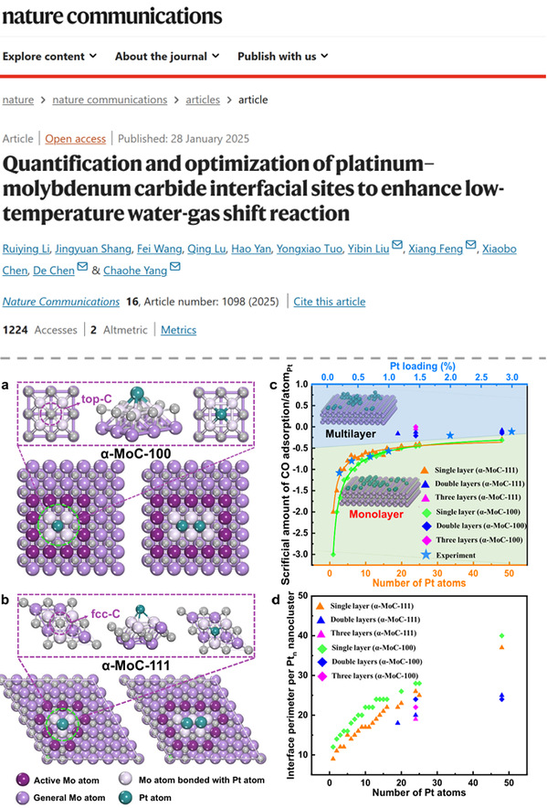 水煤气变换(water-gas shift,WGS)的工业应用已有90多年的历史,WGS反应不仅是重要的制氢(H2)来源,也是去除CO的关键过程。研究团队提出了一种DFT计算和化学吸附相结合的方法来定量分析Pt/α-MoC催化剂中Pt团簇尺寸的方法,通过搭建不同Pt原子数量的Ptn/α-MoC-111和Ptn/α-MoC-100模型,构建了包含Pt团簇尺寸、铂原子的CO吸附损失量、界面周长的数据库。研究发现,在100-200oC的低温水煤气变换反应中,碳化钼上完全暴露的单层Pt纳米团簇表现出的质量活性比块状碳化钼催化剂高出一到两个数量级,可实现Pt原子的最大化利用,其CO转化率在160 °C温度下达到97.6%。同时,此方法有效地量化了描述活性位密度的关键指标-界面周长,也为了解Pt的微观结构提供了突破性的见解。相关成果以“Quantification and optimization of platinum-molybdenum carbide interfacial sites to enhance low-temperature water-gas shift reaction”为题发表在NatureCommunications上,威廉希尔体育(华东)为第一署名单位。