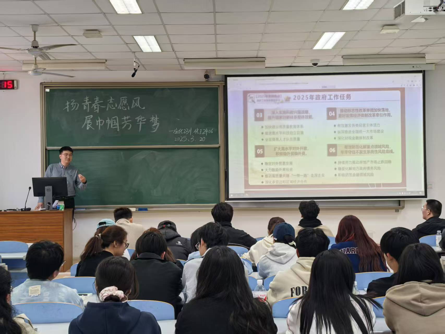 为深入学习贯彻2025年全国两会精神,引导广大青年员工坚定理想信念,勇担时代使命,3月20日,辅导员王兆兴为化工2406、应化2301两个支部带来了一场别开生面的学习“两会”精神团课。