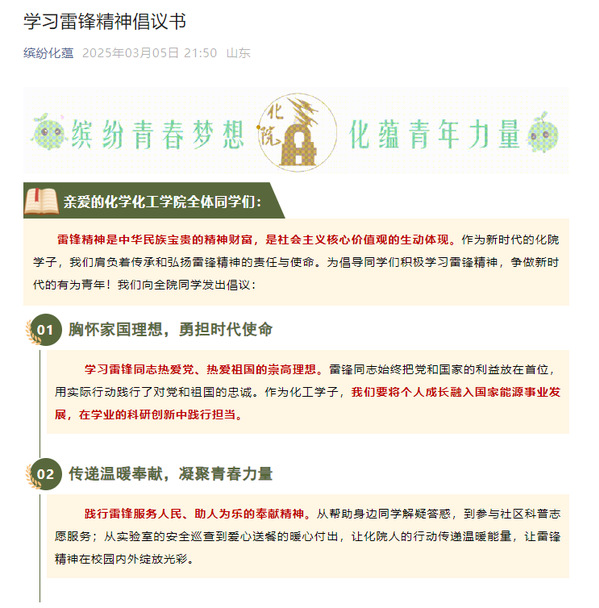 雷锋精神是中华民族宝贵的精神财富,是社会主义核心价值观的生动体现。在第62个学雷锋纪念日,学院发布学习雷锋精神倡议书,呼吁同学们积极学习雷锋精神,用实际行动践行雷锋精神,争做新时代的雷锋精神传人,为实现中华民族伟大复兴的中国梦贡献青春力量!