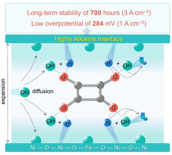 碱性水电解阳极端析氧反应在工业大电流下的多步快速脱质子导致的腐蚀性酸性界面微环境是限制其稳定性的关键问题之一。一些电催化衍生的功能阴离子在调节界面微环境方面表现出特殊的功能,但这一问题在学术界中没有得到足够的重视。董斌教授团队的研究证明了配位方酸在碱性析氧重构过程中经历了溶解-再嵌入过程,导致其以方酸阴离子的形式稳定在铁掺杂的NiOOH层间。这些插层的方酸阴离子通过多重氢键相互作用稳定氢氧根离子,这有助于保持较高的催化界面碱度。因此,大电流下析氧催化界面的酸化现象受到抑制,当暴露于3.0 A cm−2时,其催化耐久性与典型的NiFe-LDH材料相比延长了10倍(从65到700小时)。这种衍生的功能阴离子通过控制界面碱度,保证了镍铁衍生电催化剂在大电流密度下的持久催化性能。