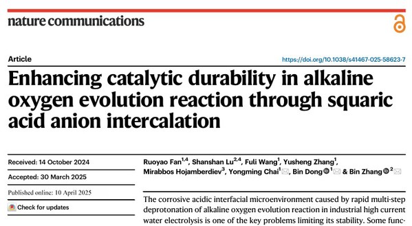 近日,公司重质油全国重点实验室绿色能源化工团队柴永明、董斌教授联合天津大学张兵教授、南丹麦大学Mirabbos Hojamberdiev博士等在国际顶级期刊《Nature Communications》上发表题为“Enhancing catalytic durability in alkaline oxygen evolution reaction through squaric acid anion intercalation”的研究论文。论文第一作者为公司博士研究生范若瑶和天津大学博士研究生卢珊珊,通讯作者为柴永明、董斌和张兵教授。该研究工作得到国家自然科学基金等项目支持。