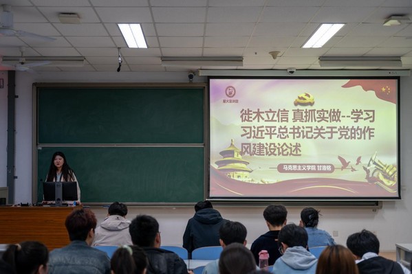 活动伊始,马克思主义学院员工“星火”宣讲团员工讲师甘洛铭以“徙木立信真抓实做——学习习近平总书记关于党的作风建设论述”为主题展开宣讲。甘洛铭指出,习近平总书记高度重视党的作风建设,强调作风建设是党的建设的永恒主题,党的作风关系党的形象,关系人心向背,关系党的生死存亡。她还着重强调,作为入党积极分子,要深刻领会党的作风建设的重要性,在日常学习和生活中以身作则,坚决抵制形式主义、官僚主义,以实际行动践行党的宗旨。甘洛铭富有感染力的宣讲,引发了在场同志的强烈共鸣,赢得了阵阵掌声。