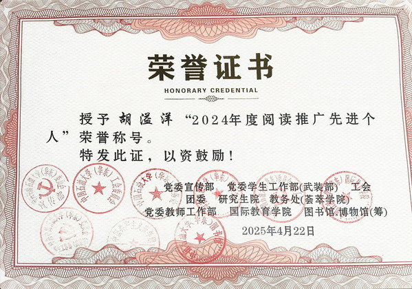胡溢洋获评2024年读阅读推广先进个人