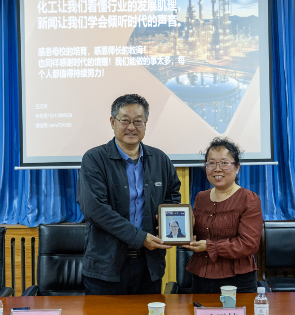 王巧然深情回顾了在学院的求学经历,她感谢了学院的悉心培养,在今天的交流研讨中感受到了一代代化院新闻工作者的薪火传承。她向员工们分享了自己报道沙漠公路绿化工程、油品质量升级、福建长汀催化剂项目的工作经历。她指出,石油石化行业是关系国计民生和能源安全的重要支柱,新闻工作者要有使命感、践行好社会责任。她建议在座的员工记者要多观察勤思考、主动学习高质量新闻作品,用好专业优势,在挖掘线索和撰写新闻的过程中不断提高自己的写作功底。