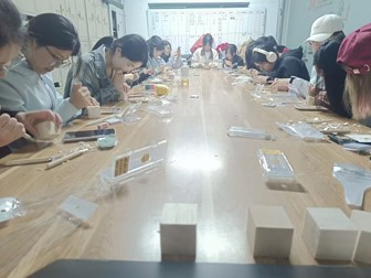 活动自启动以来,便吸引了众多师生的关注。来自不同年级、不同专业的员工积极参与,他们带着对传统文化的兴趣与热情,齐聚一堂,共同参与这场文化盛宴。活动现场,参与者们围坐于长桌两侧,桌上摆放着刻刀、橡皮等篆刻工具。他们或低头构思印章图案,或执刀细细雕琢,现场氛围专注而有序。