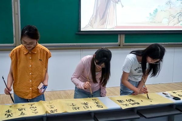 在书写过程中,大家尝试临摹经典碑帖,感受古人笔下的神韵。当看到自己写出的第一个完整的字,教室里不时传来惊喜的感叹声。随着练习的深入,原本歪歪扭扭的笔画逐渐变得规整,一个个充满活力的汉字跃然纸上。大家还相互交流作品,分享自己的心得与体会,现场氛围热烈而融洽 此次书法体验活动,不仅让大家掌握了基础的书法技巧,更在心中播下了热爱传统文化的种子。它是一场文化的盛宴,一次心灵的沉淀,让大家在快节奏的学习生活中,放慢脚步,领略书法之美,感悟中华文化的博大精深。未来,我支部将继续开展更多丰富多彩的文化活动,让支部成员在实践中传承和弘扬中华优秀传统文化,让传统文化在校园中绽放新的光彩!